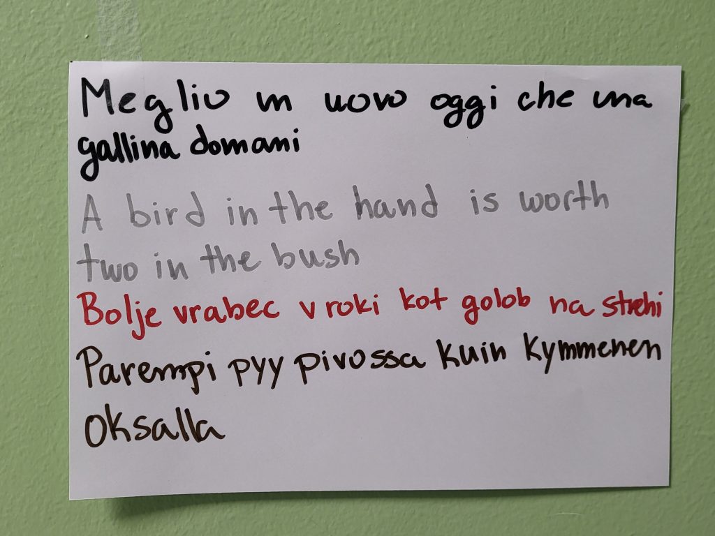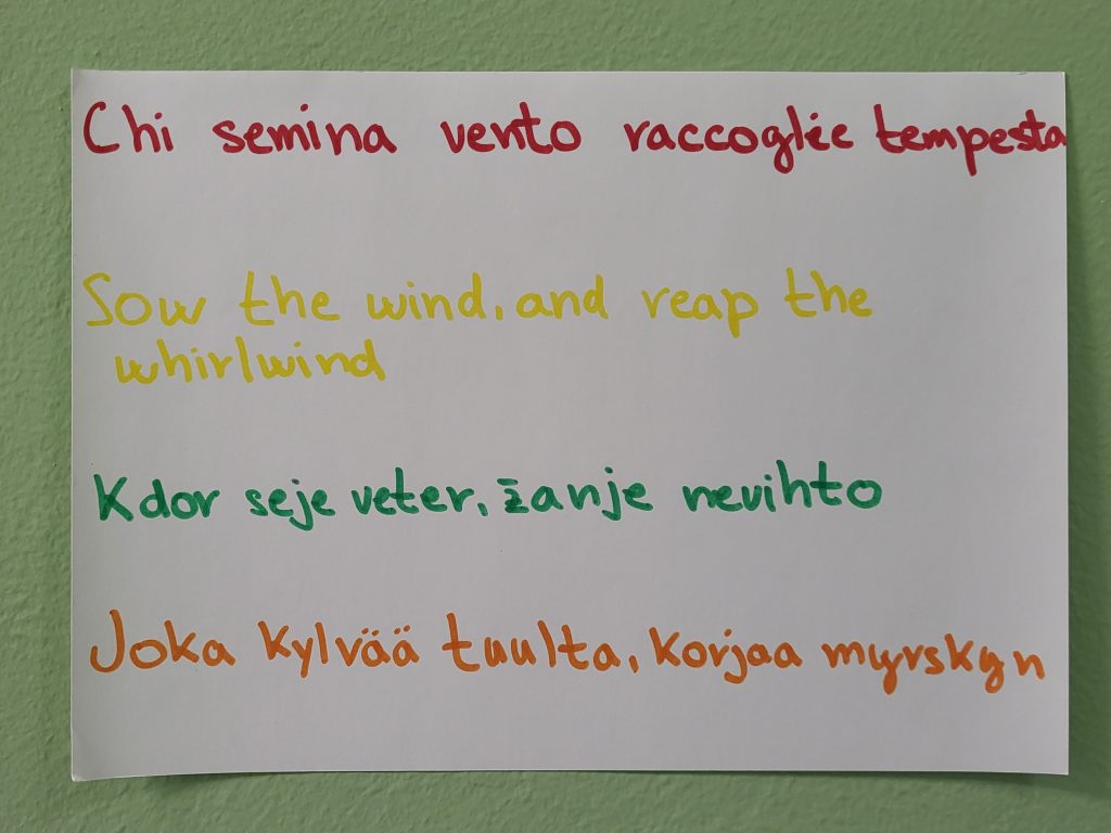 Dal 16 febbraio, nell’ambito del progetto Erasmus+ IDEA, ospitiamo a scuola due studentesse finlandesi originarie di Seinäjoki, Aliina e Helmi. Durante questo mese di permanenza da noi hanno seguito le lezioni in alcune materie, hanno partecipato a diverse uscite e attività e hanno presentato il loro paese e la loro scuola ai nostri alunni. Oggi abbiamo organizzato insieme un laboratorio linguistico sui modi di dire nelle rispettive lingue ed è stata un’occasione utile e divertente per confrontare lingue e culture diverse. Le ragazze finlandesi sono ospiti delle nostre alunne Lia e Solidea che si recheranno in Finlandia nel prossimo anno scolastico.